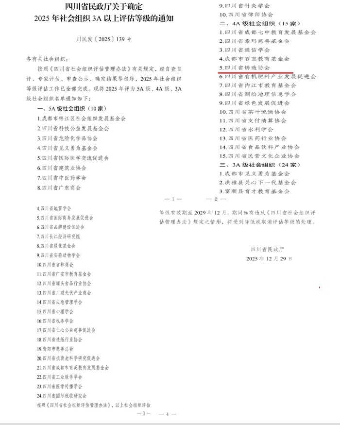 按照《四川省社会组织评估管理办法》有关规定,经自查、专家评估、审查公示、确定结果等程序,四川省铸造协会顺利通过2025年社会组织等级评估验收,继2016年后再次被四川省民政厅评估为 4A 级省级协会。